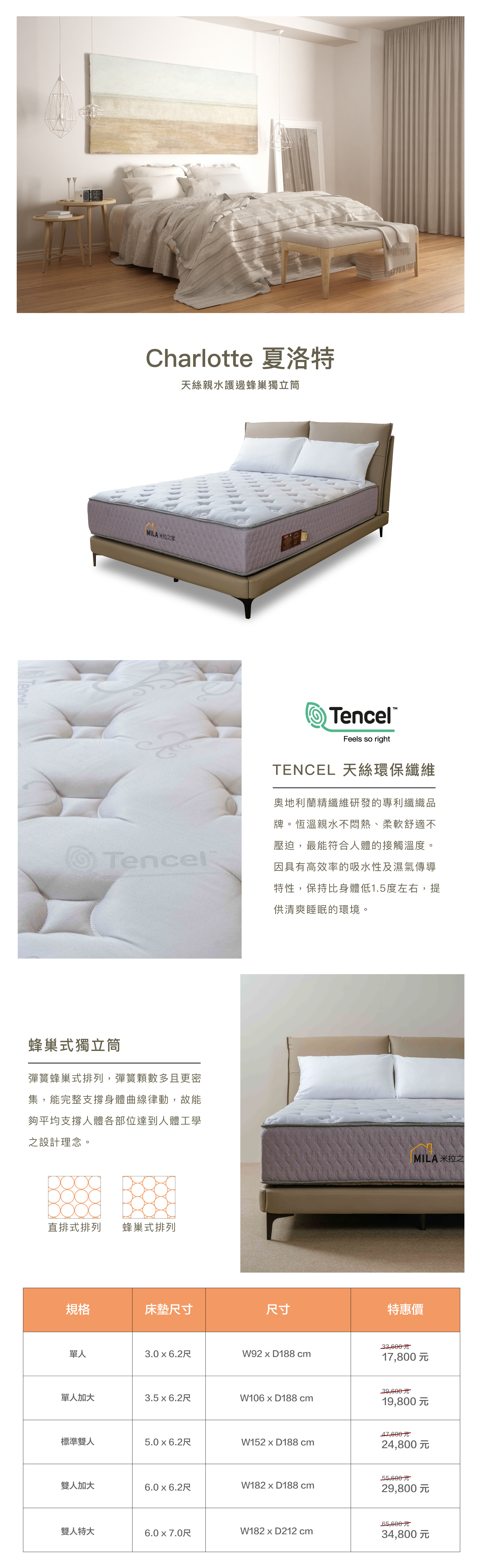 採用奧地利TENCEL天絲環保纖維,具備如絲般柔軟與優異吸濕性,保持清爽親膚,提供恆溫舒適的睡眠環境。蜂巢式獨立筒彈簧設計,密集排列支撐身體曲線,分散壓力,並配有泡棉護框,增強穩定性,避免床邊下陷,確保長期耐用與舒適,躺感軟中帶有支撐。
