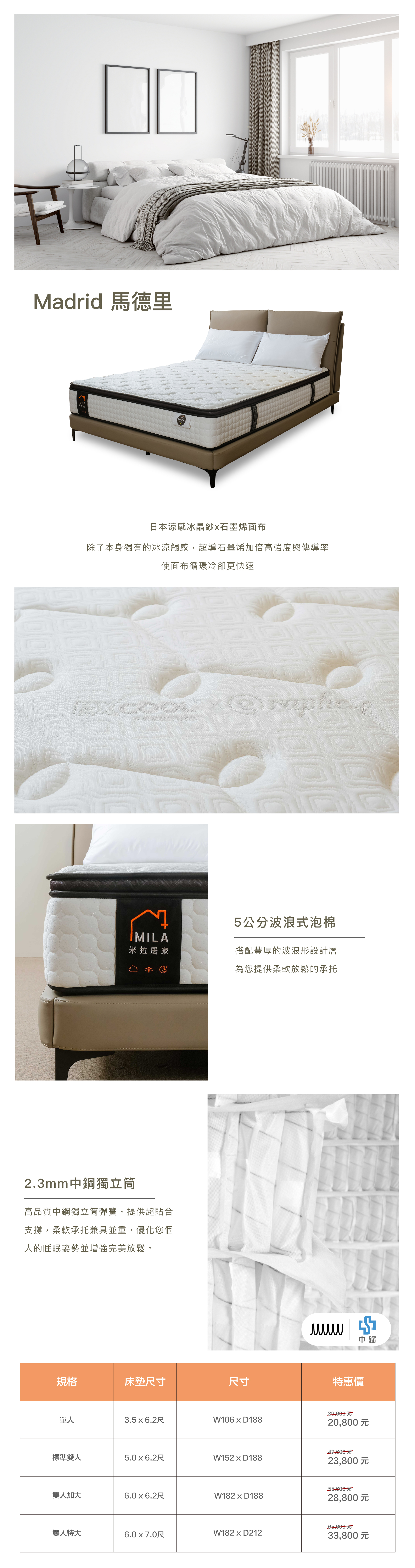 融合日本涼感冰晶紗與超導石墨烯纖維,提供冰涼觸感與快速冷卻效果。5公分波浪式泡棉層柔軟承托,高品質2.3mm中鋼獨立筒彈簧支撐,完美貼合身體,優化睡眠姿勢。免翻面設計,床墊高度26-27cm,軟硬度多樣選擇,滿足不同需求,提升您的睡眠質量。